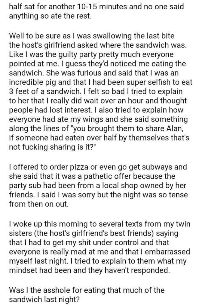 AITA because I ate more than “my share” of a 6 foot party sub last night?