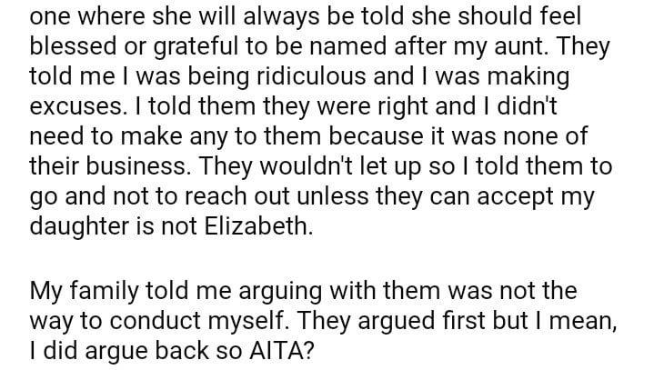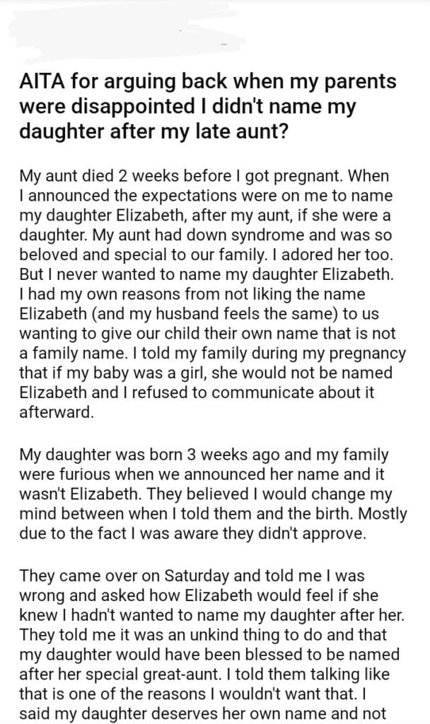 AITA for arguing back when my parents were disappointed I didn’t name my daughter after my late aunt?