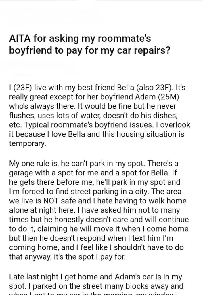 AITA for asking my roommate’s boyfriend to pay for my car repairs?