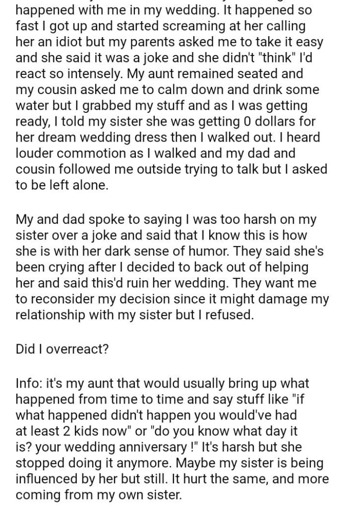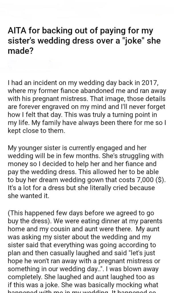 AITA for backing out of paying for my sister’s wedding dress over a “joke” she made?