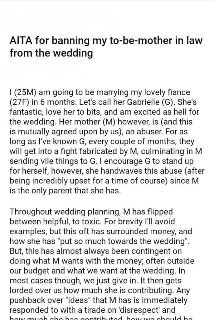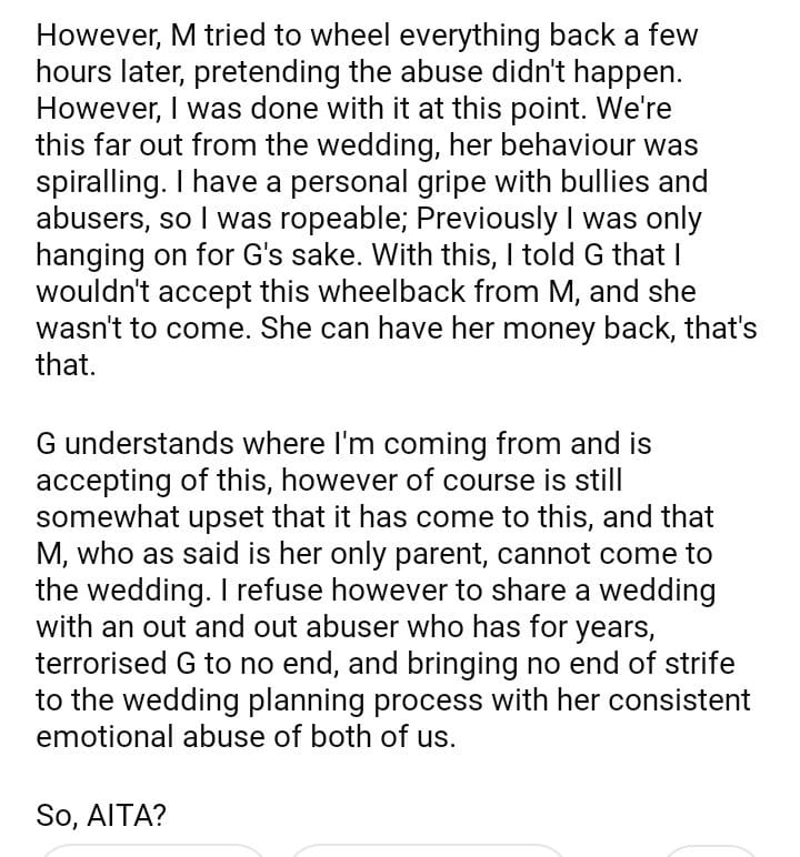AITA for banning my to-be-mother in law from the wedding