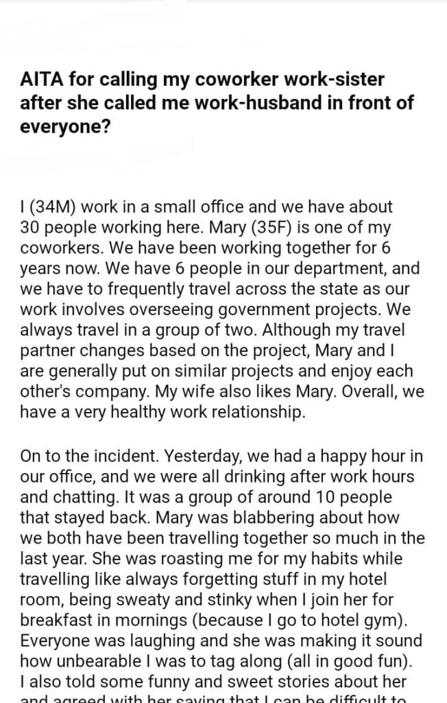 AITA for calling my coworker work-sister after she called me work-husband in front of everyone?