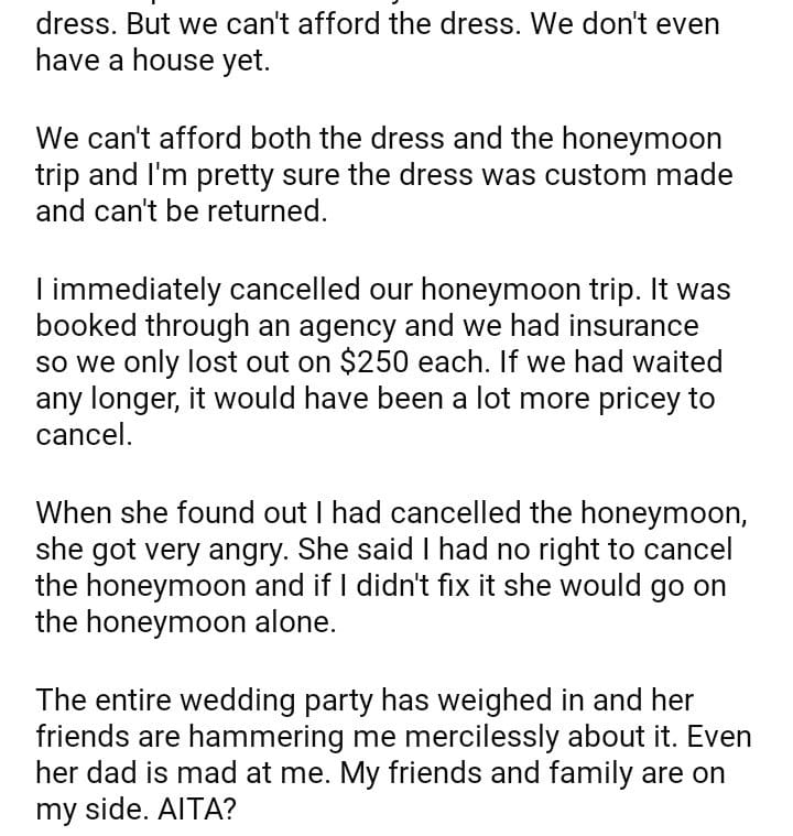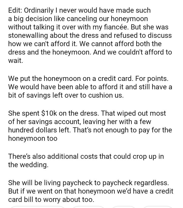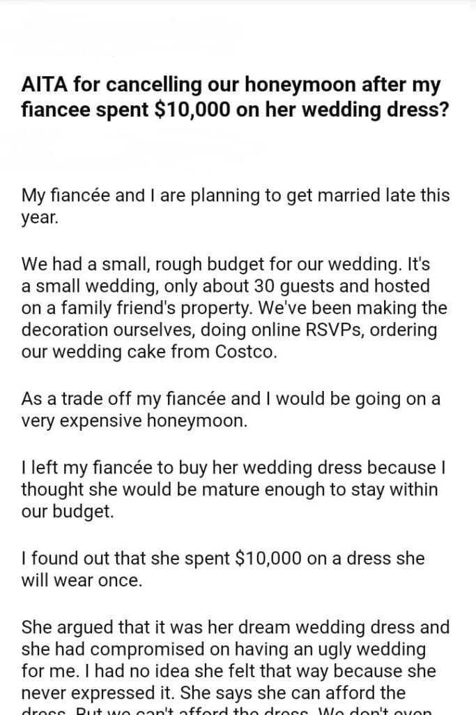 AITA for cancelling our honeymoon after my fiancee spent $10,000 on her wedding dress?