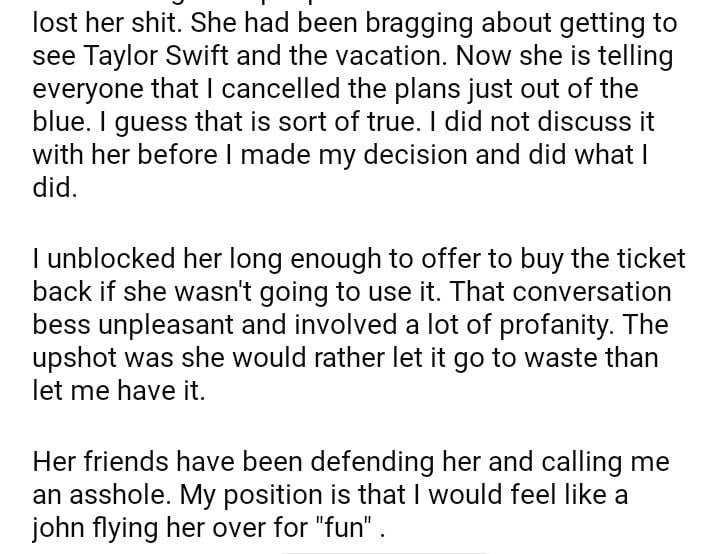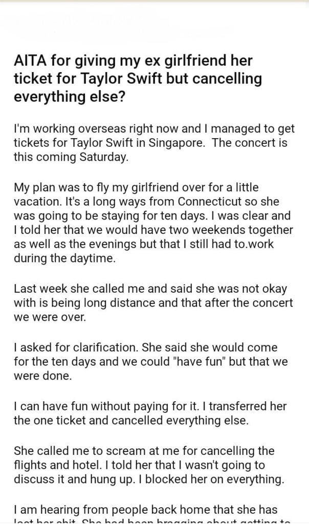 AITA for giving my ex girlfriend her ticket for Taylor Swift but cancelling everything else?