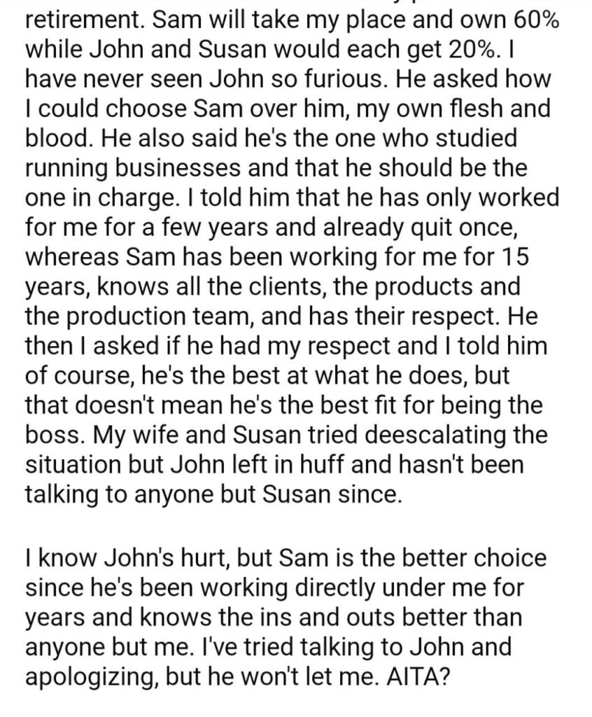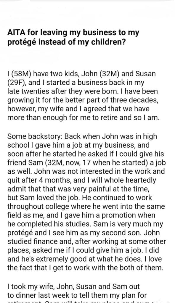 AITA for leaving my business to my protégé