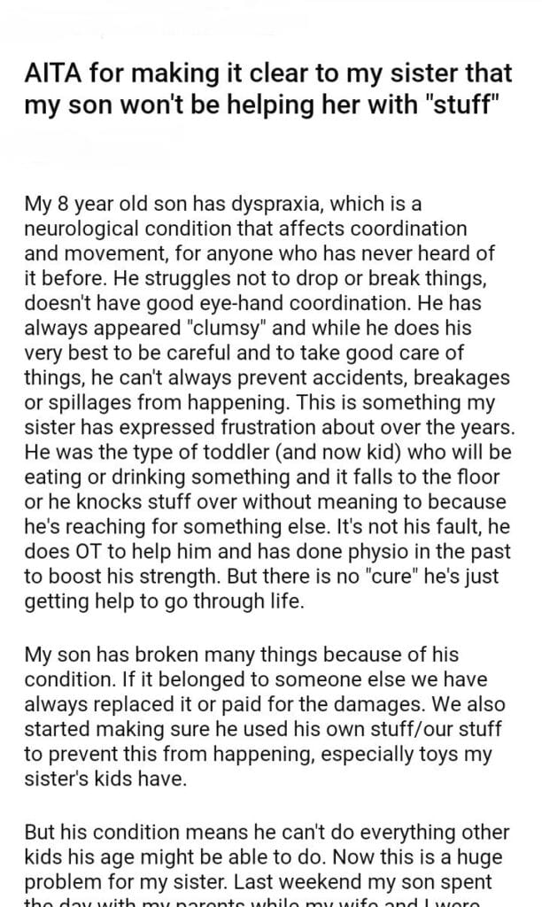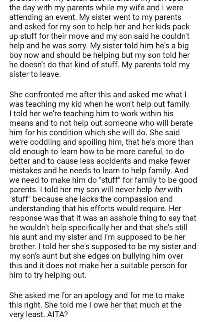 AITA for making it clear to my sister that my son won’t be helping her with “stuff”
