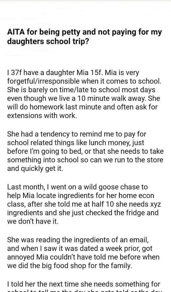 AITA for my daughters school trip?