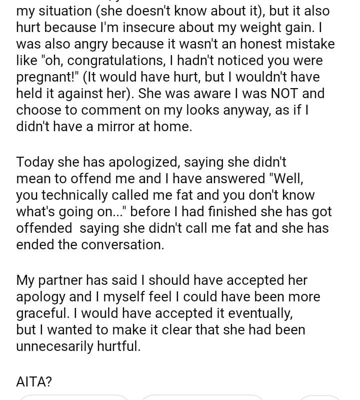 AITA for not accepting an apology from someone who said I look pregnant?
