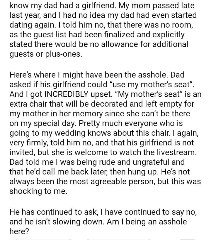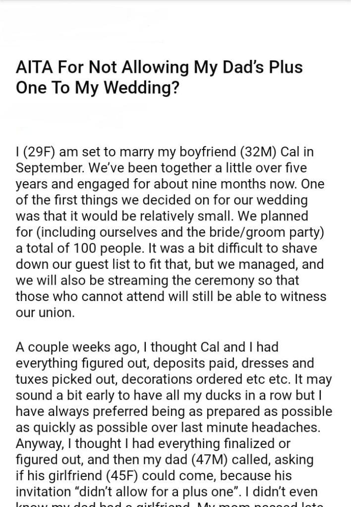 AITA For Not Allowing My Dad’s Plus One To My Wedding?