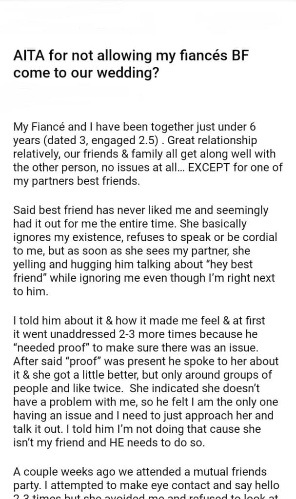 AITA for not allowing my fiancés BF come to our wedding?