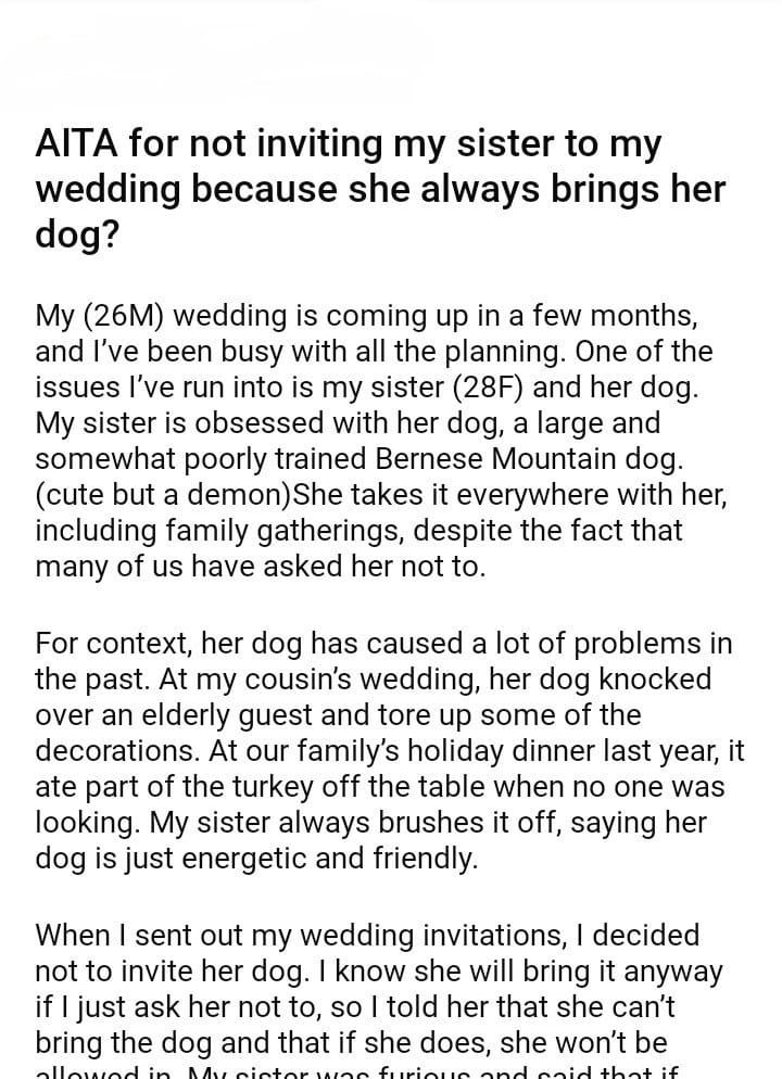 AITA for not inviting my sister to my wedding because she always brings her dog?