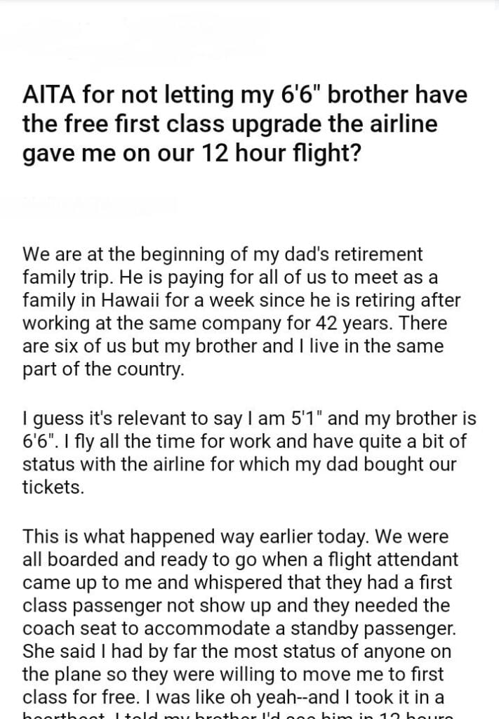 AITA for not letting my 6’6″ brother have the free first class upgrade