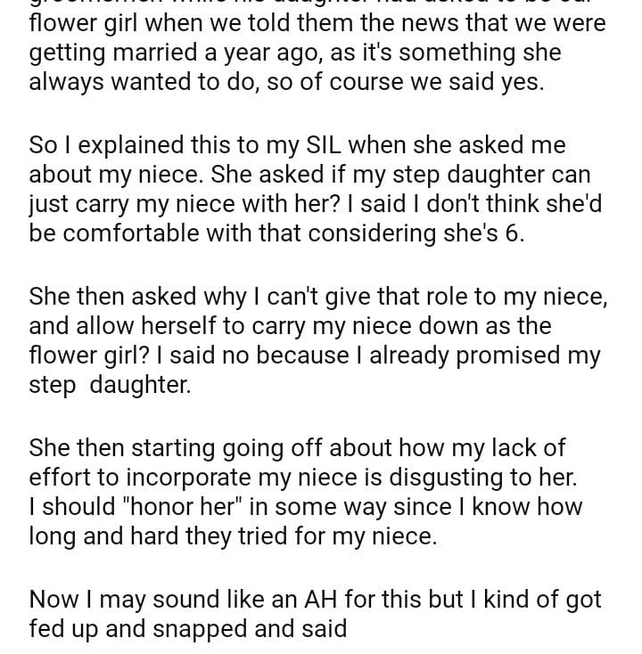 AITA for not letting my miracle baby niece be my flower girl at my wedding?