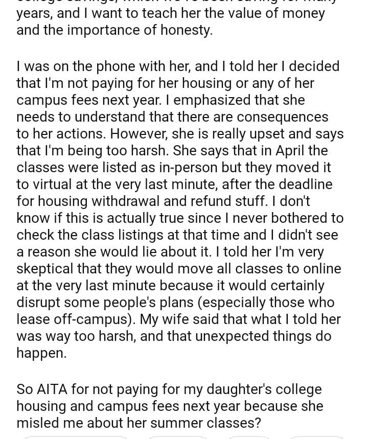 AITA for not paying for my daughter’s college housing and campus fees next year