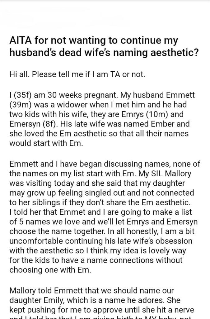 AITA for not wanting to continue my husband’s wife’s naming aesthetic?
