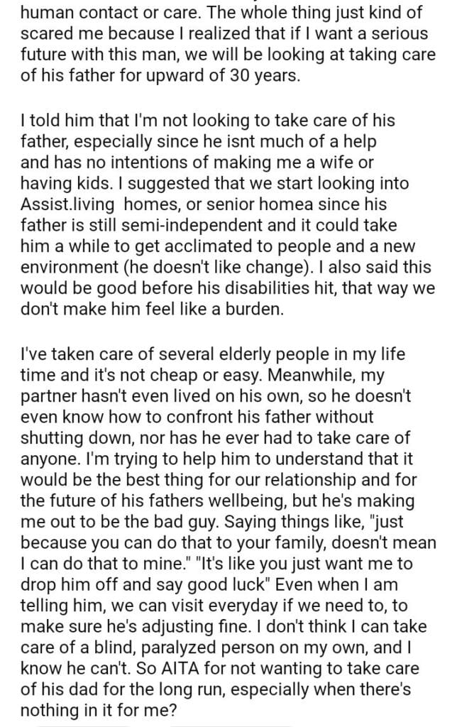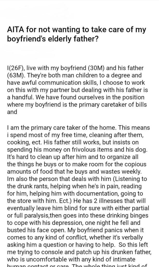 AITA for not wanting to take care of my boyfriend’s elderly father?