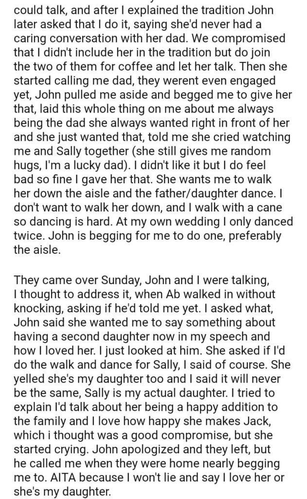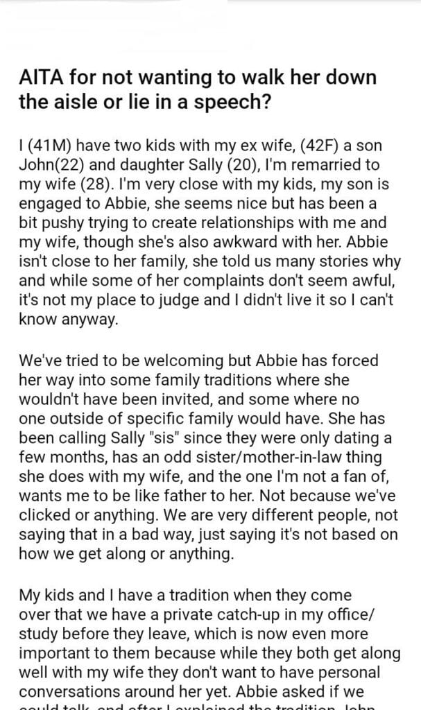 AITA for not wanting to walk her down the aisle or lie in a speech?