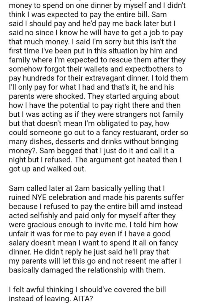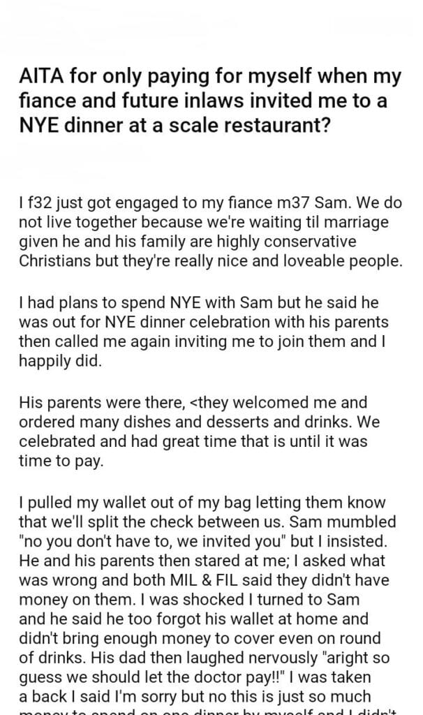 AITA for only paying for myself when my fiance and future inlaws invited me to a NYE dinner at a scale restaurant?