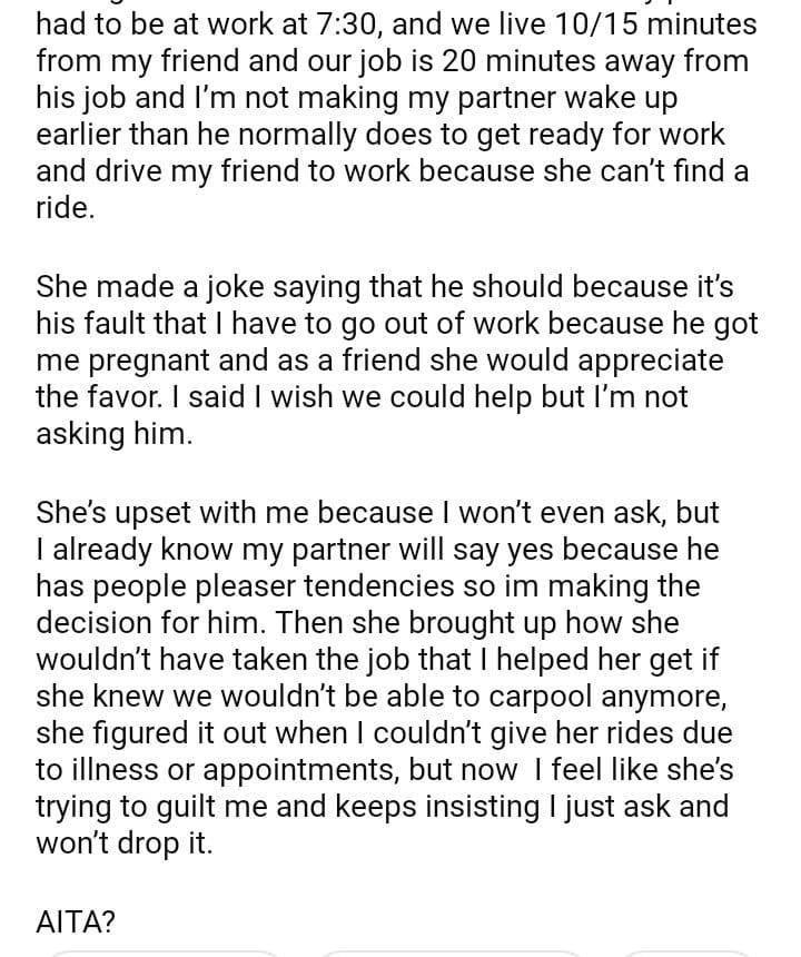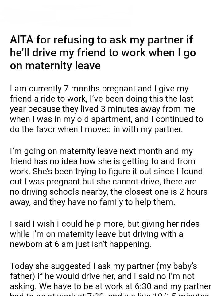 AITA for refusing to ask my partner if he’ll drive my friend to work