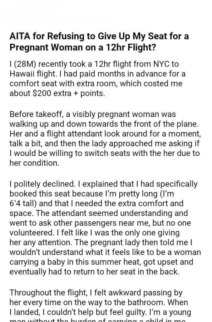 AITA for Refusing to Give My Seat for a Pregnant Woman on a 12hr Flight?