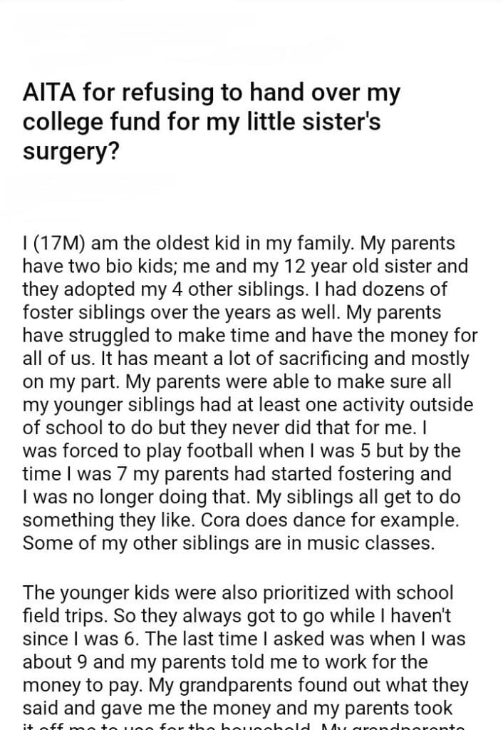 AITA for refusing to hand over my college fund for my little sister