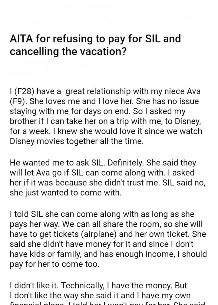 AITA for refusing to pay for SIL and cancelling the vacation?
