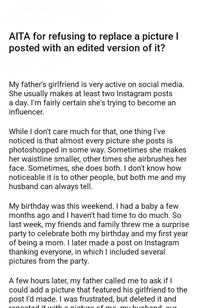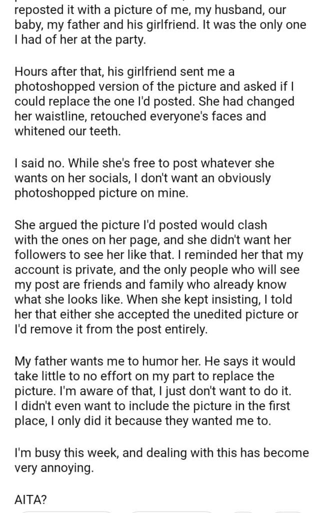 AITA for refusing to replace a picture I posted with an edited version of it?