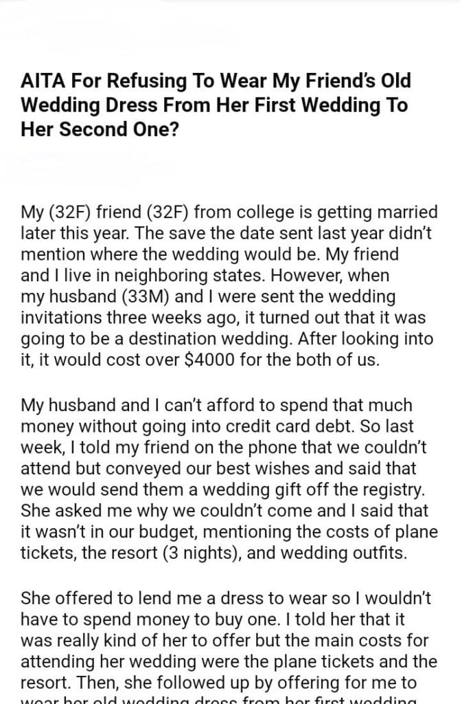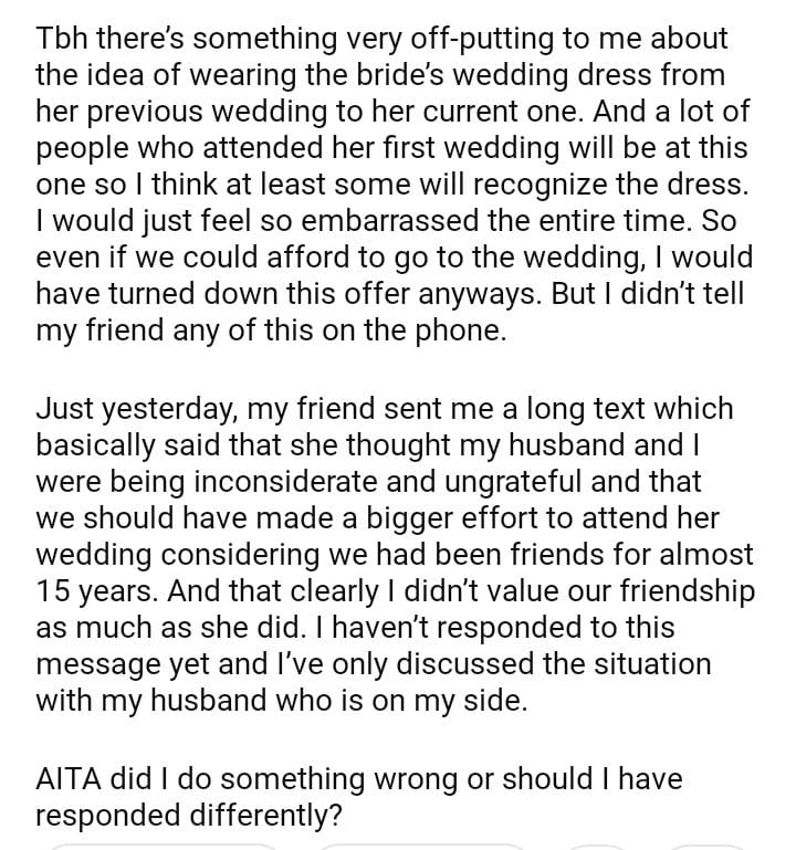 AITA For Refusing To Wear My Friend’s Old Wedding Dress