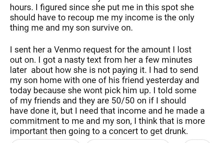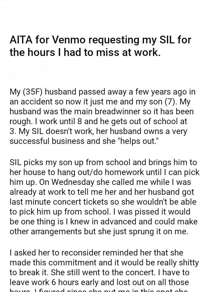 AITA for Venmo requesting my SIL for the hours I had to miss at work.
