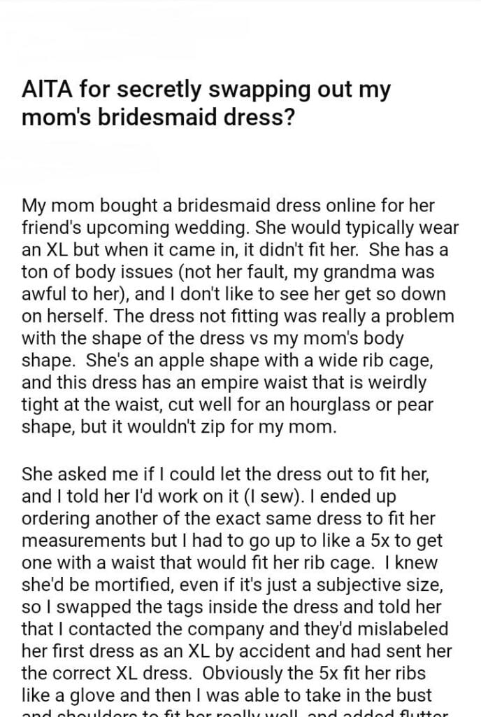 AITA for secretly swapping out my mom’s bridesmaid dress?
