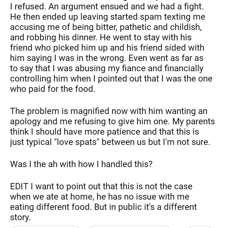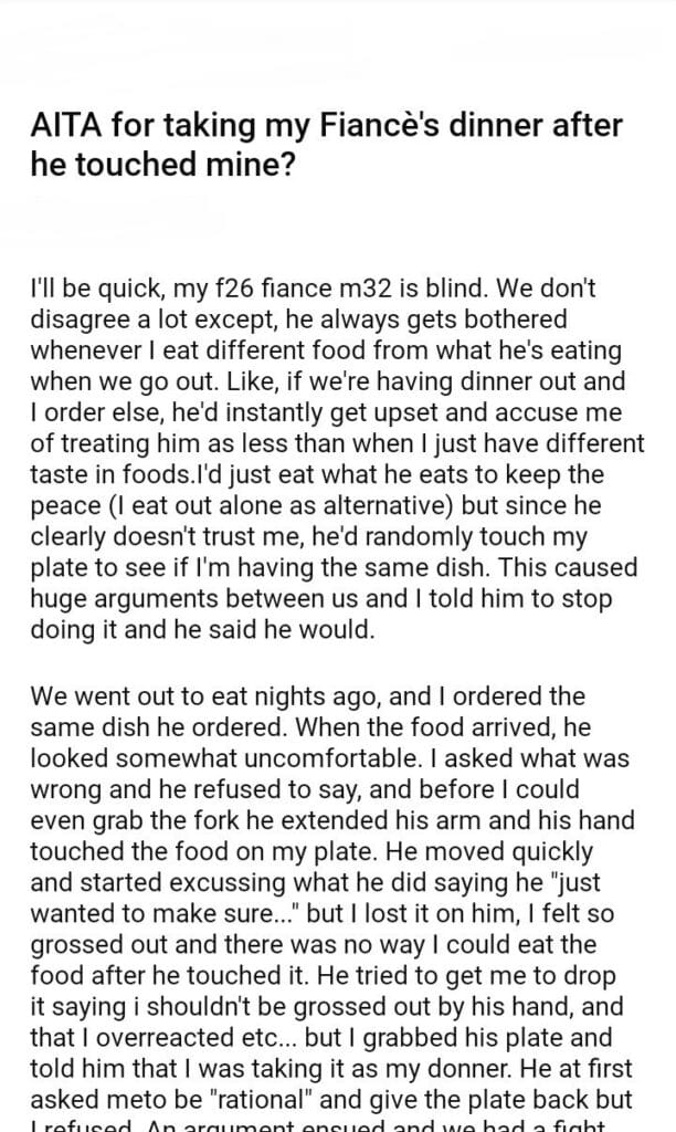 AITA for taking my Fiancè’s dinner after he touched mine?