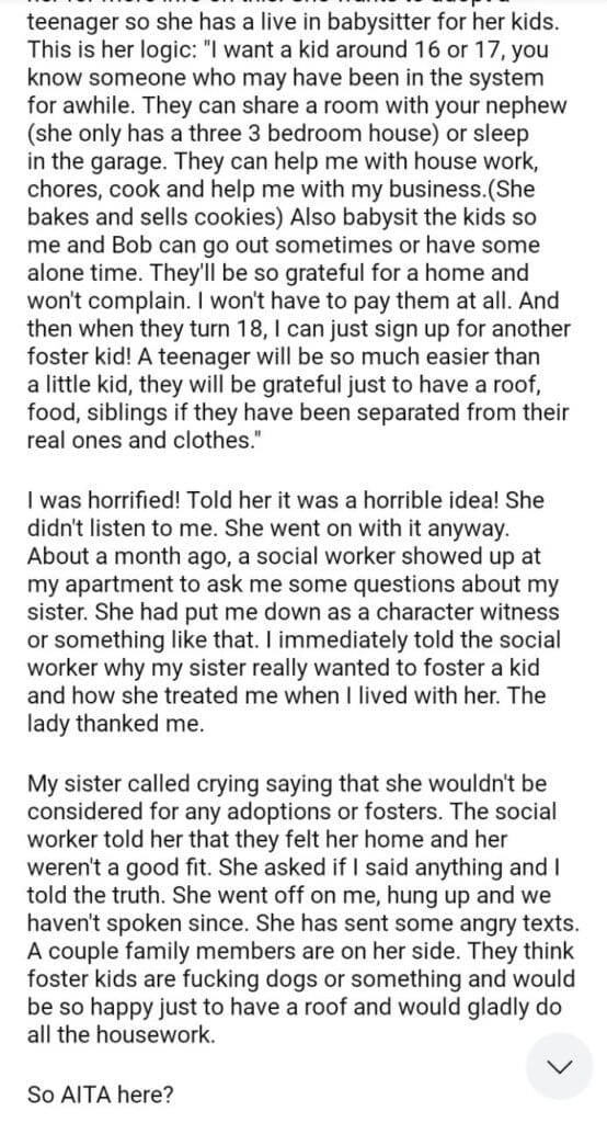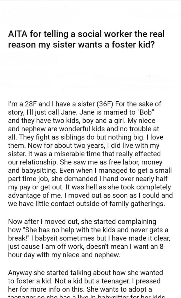AITA for telling a social worker the real reason my sister wants a foster kid?