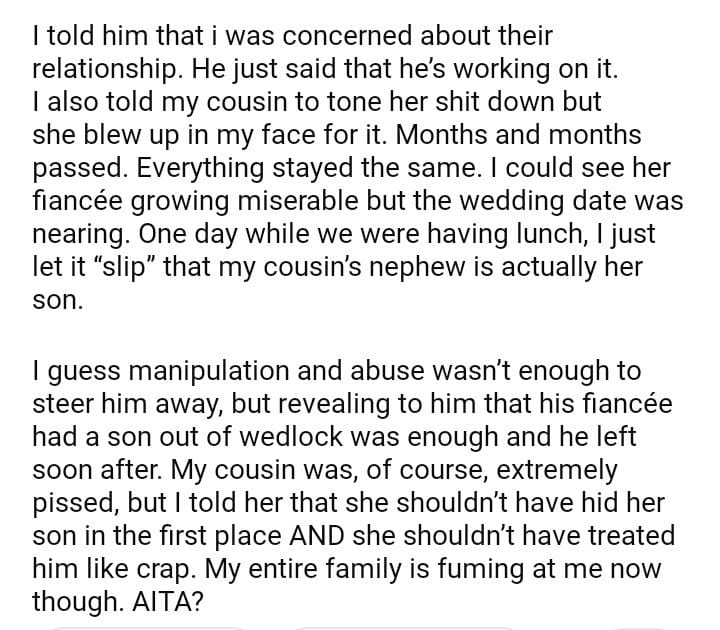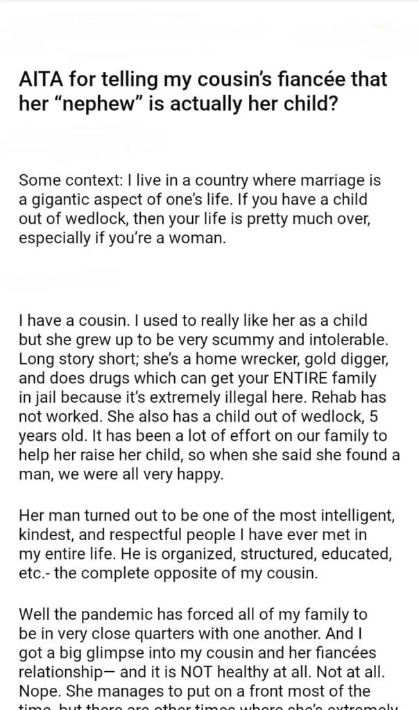 AITA for telling my cousin’s fiancée that her “nephew” is actually her child?