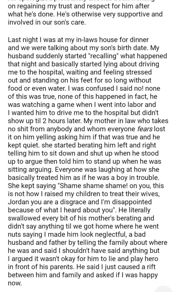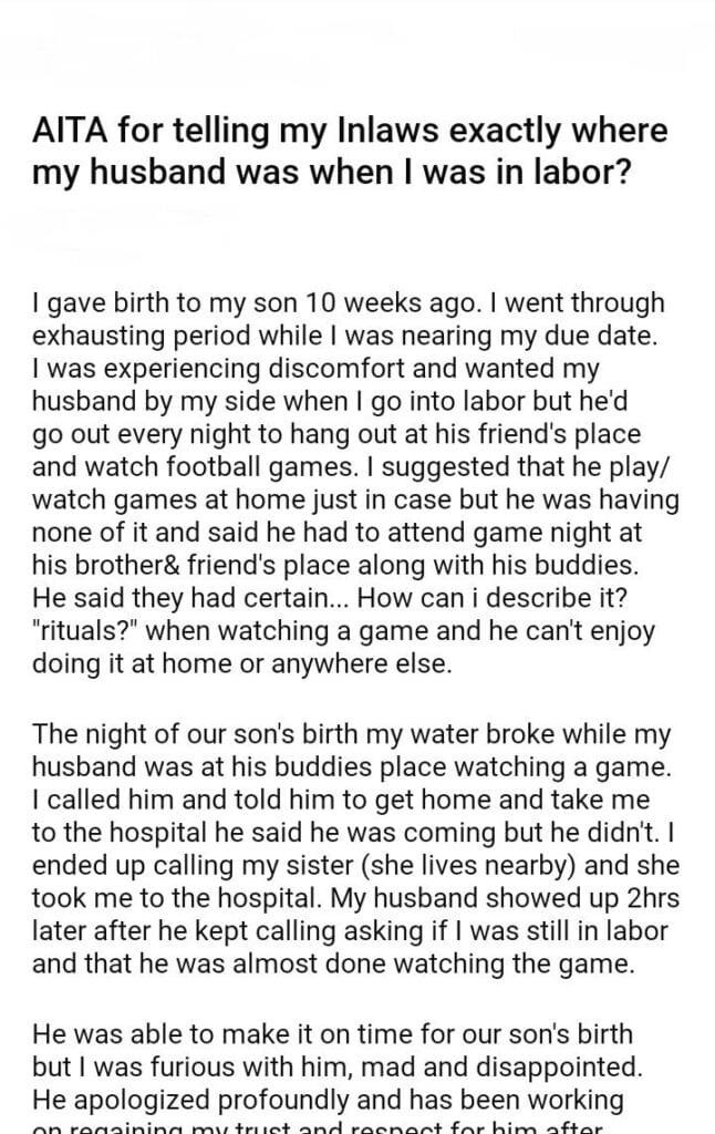 AITA for telling my Inlaws exactly where my husband was when I was in labor?