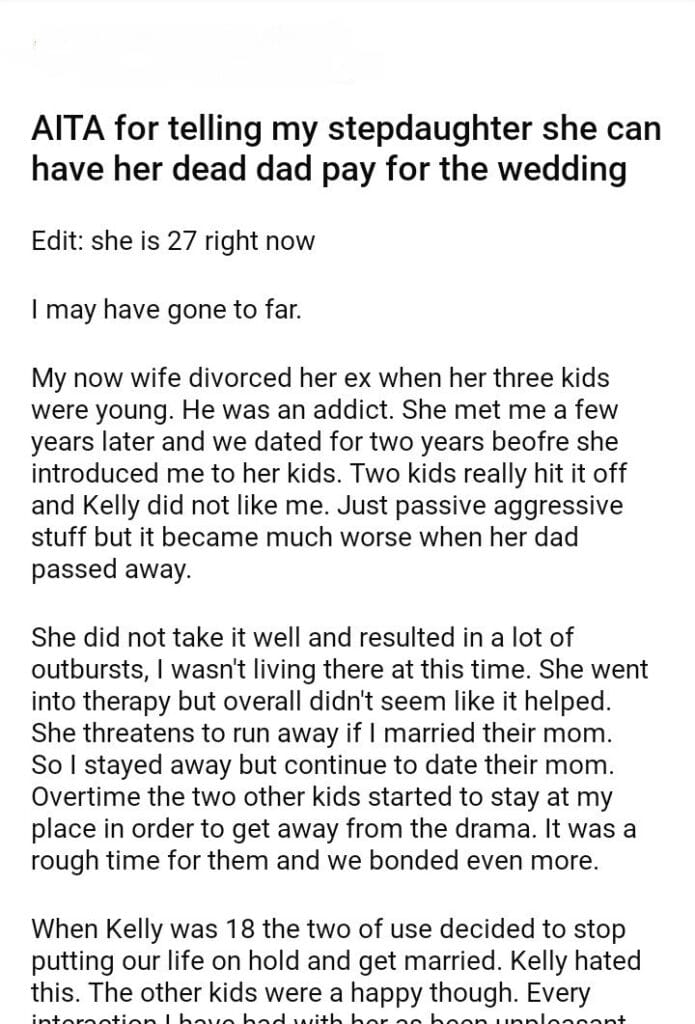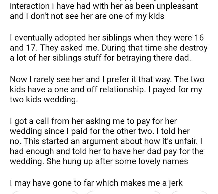 AITA for telling my stepdaughter she can have her dad pay for the wedding