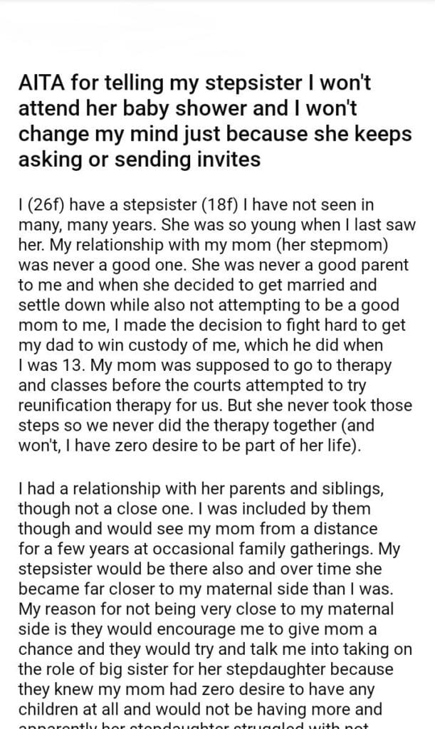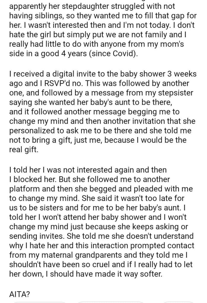 AITA for telling my stepsister I won’t attend her baby shower