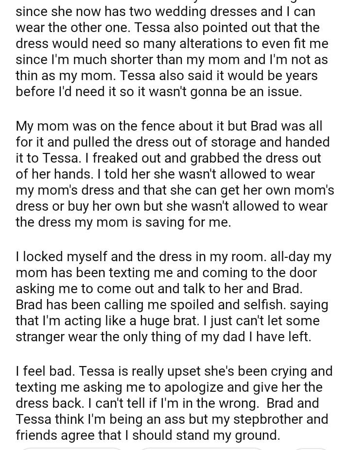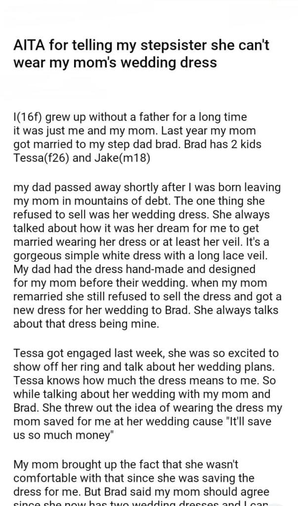 AITA for telling my stepsister she can’t wear my mom’s wedding dress
