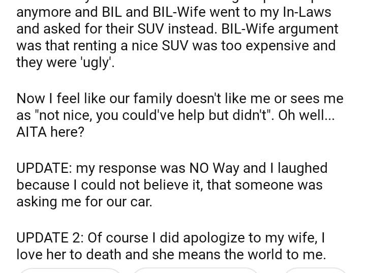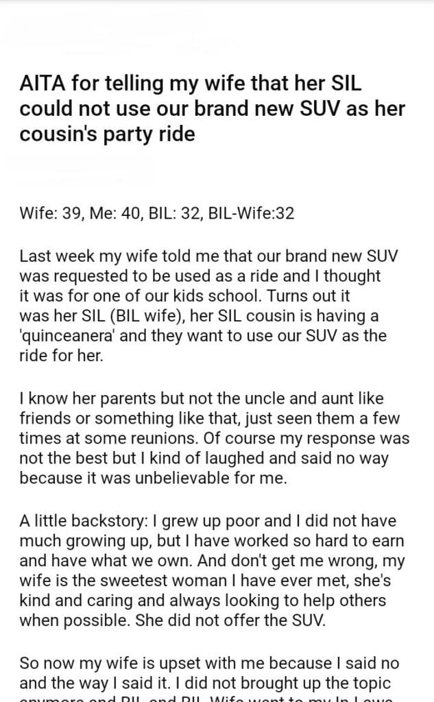 AITA for telling my wife that her SIL could not use our brand new SUV