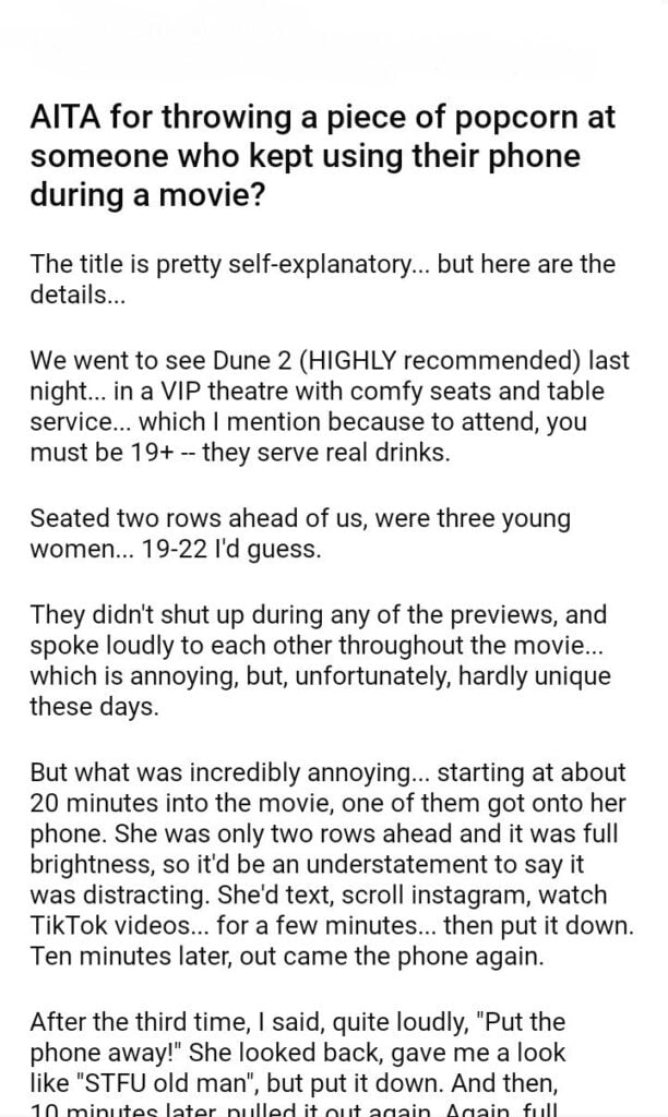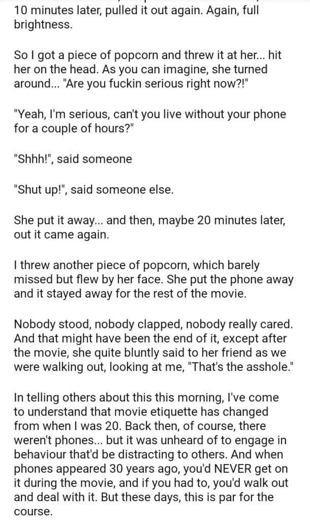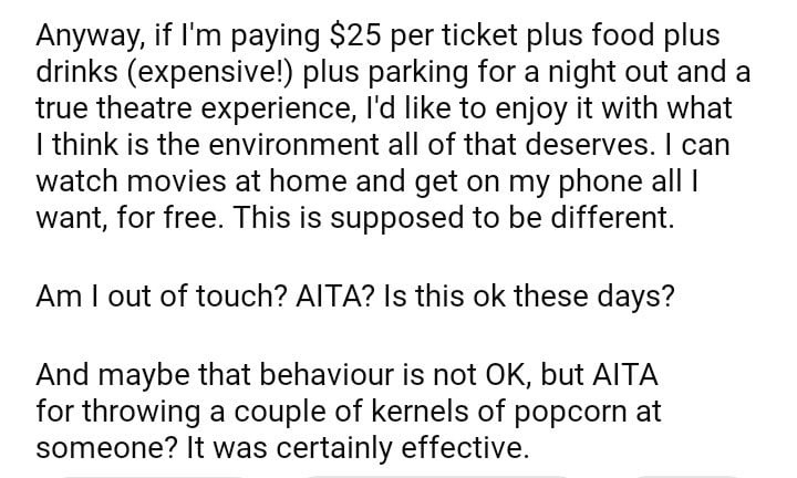 AITA for throwing a piece of popcorn at someone who kept using their phone during a movie?