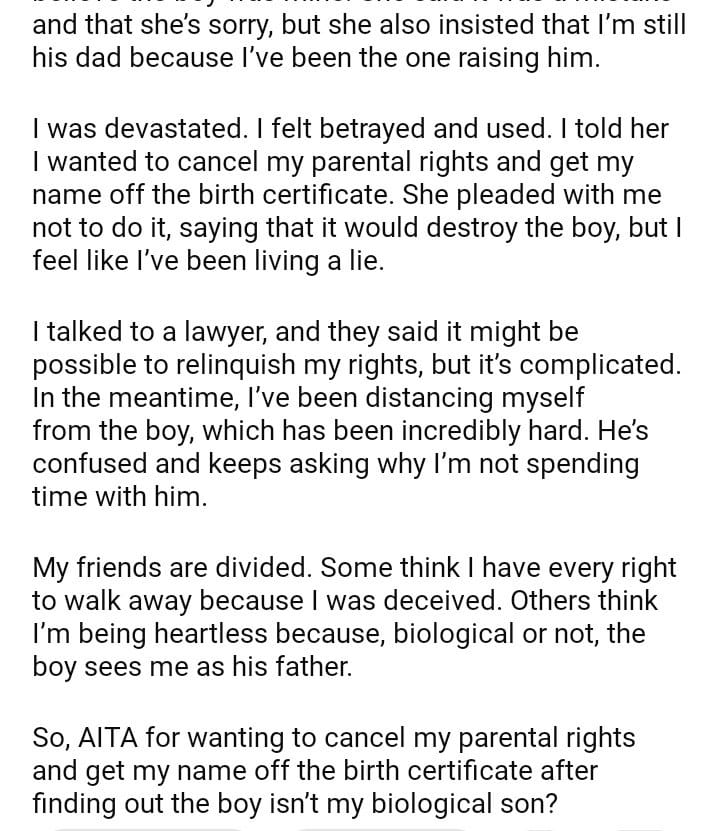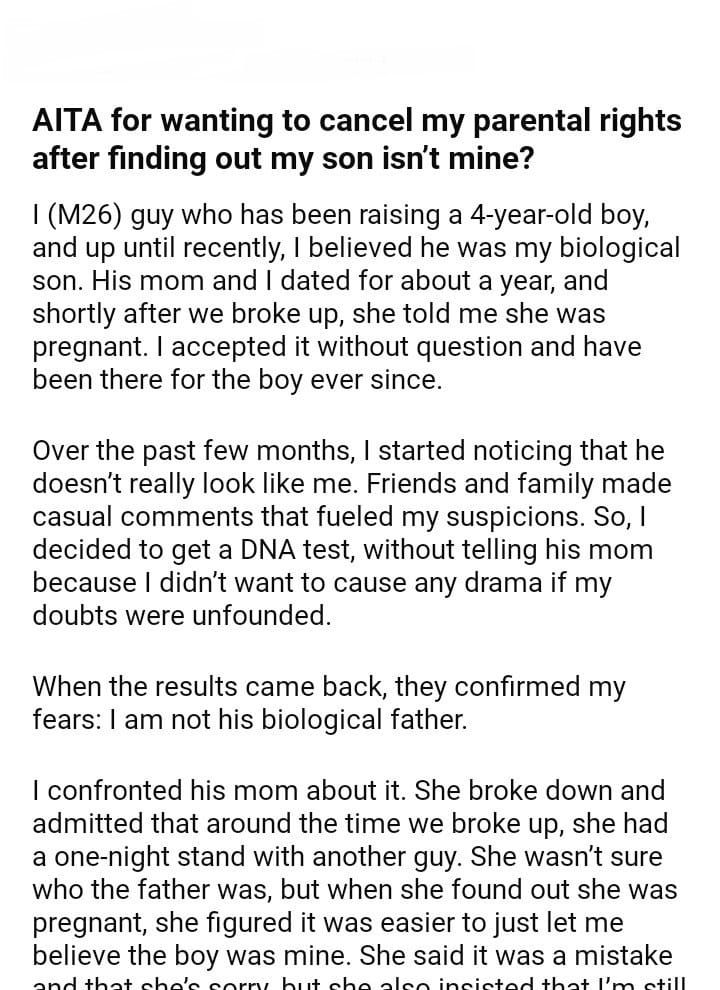 AITA for wanting to cancel my parental rights after finding out my son isn’t mine?