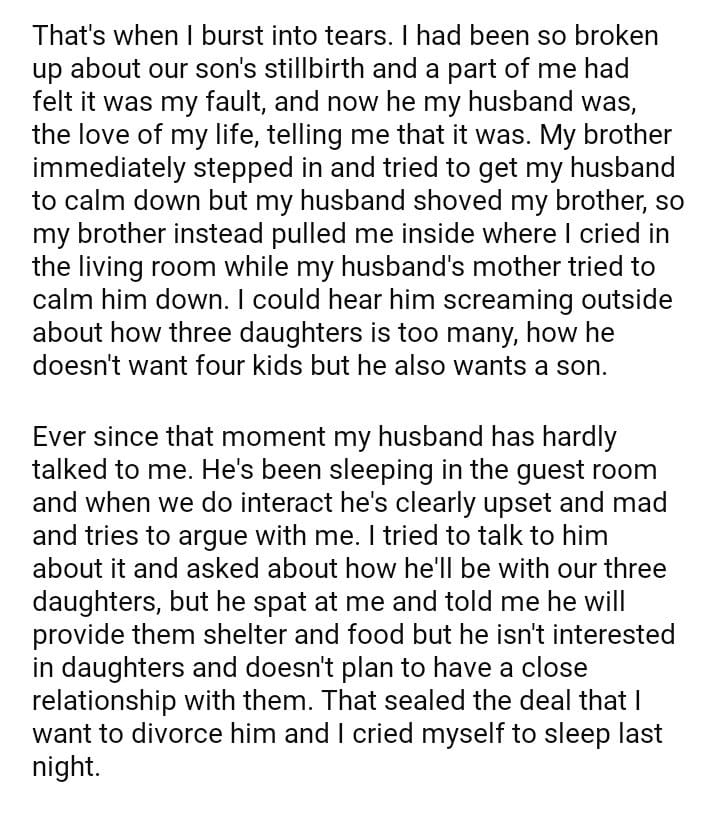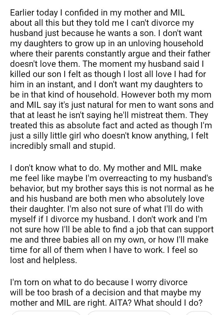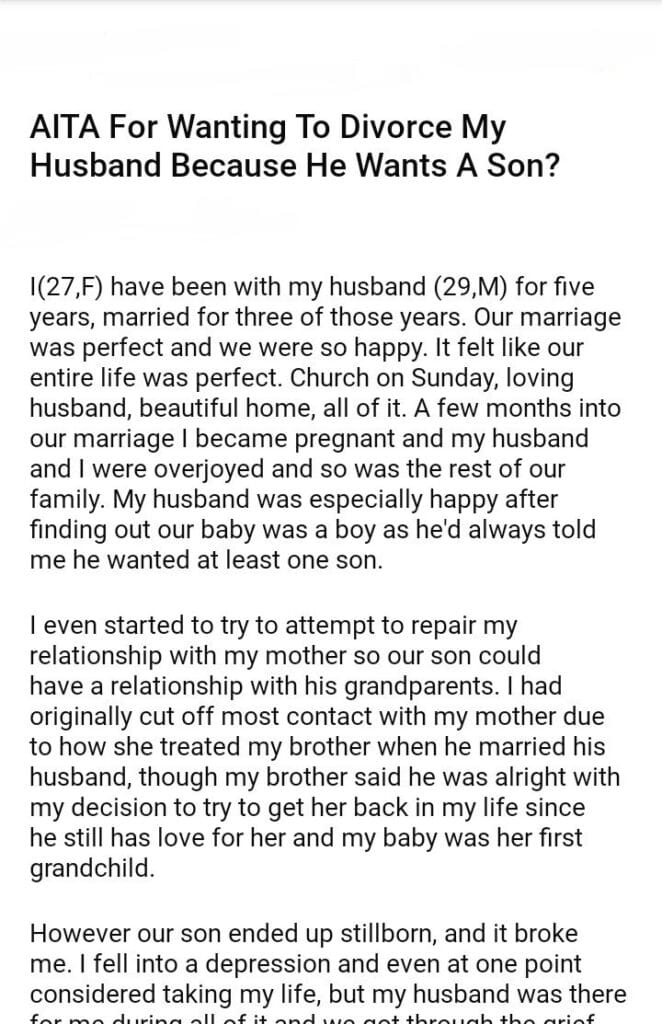 AITA For Wanting To Divorce My Husband Because He Wants A Son?