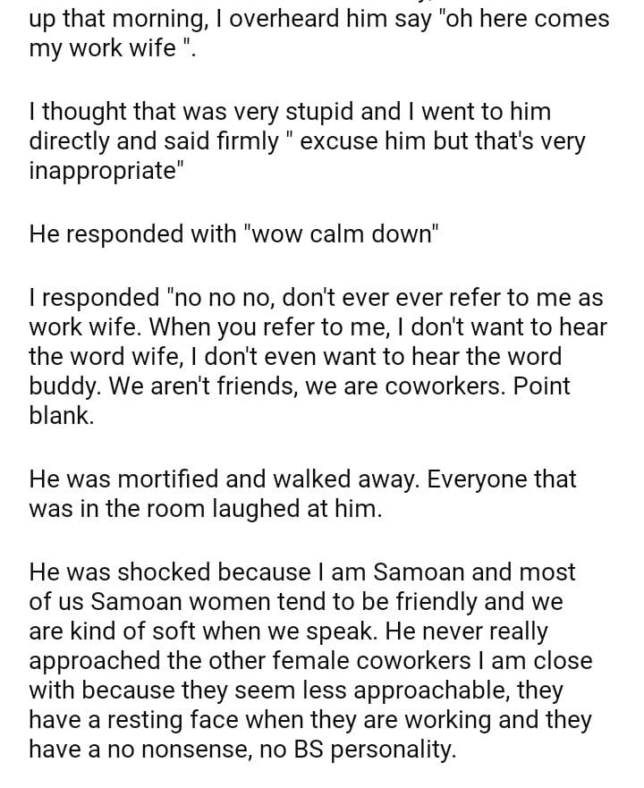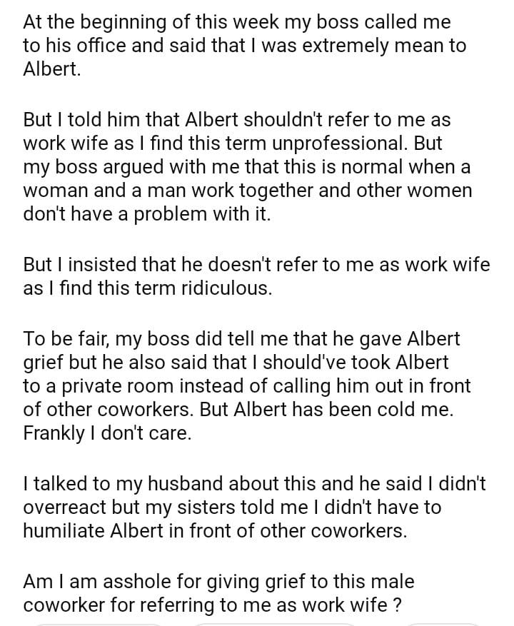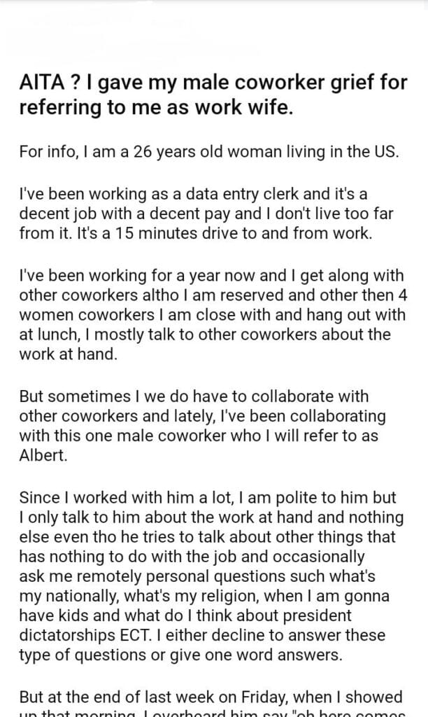 AITA ? I gave my male coworker grief for referring to me as work wife.