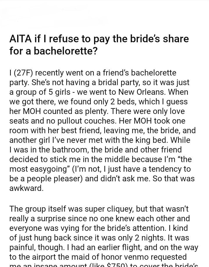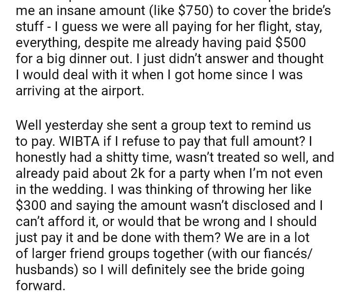 AITA if I refuse to pay the bride’s share for a bachelorette?