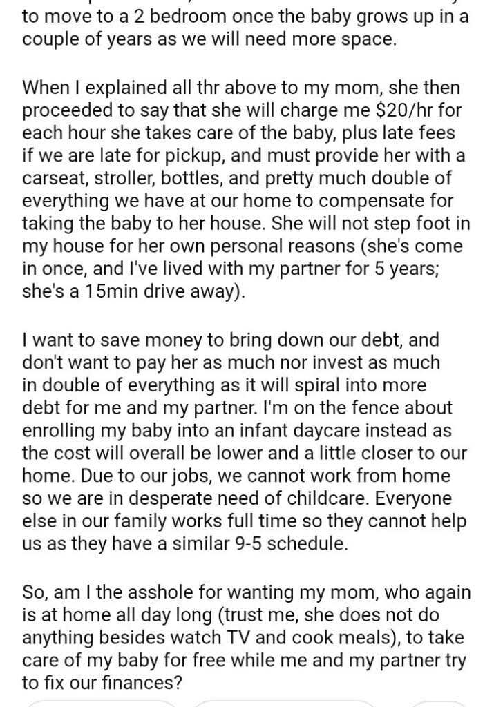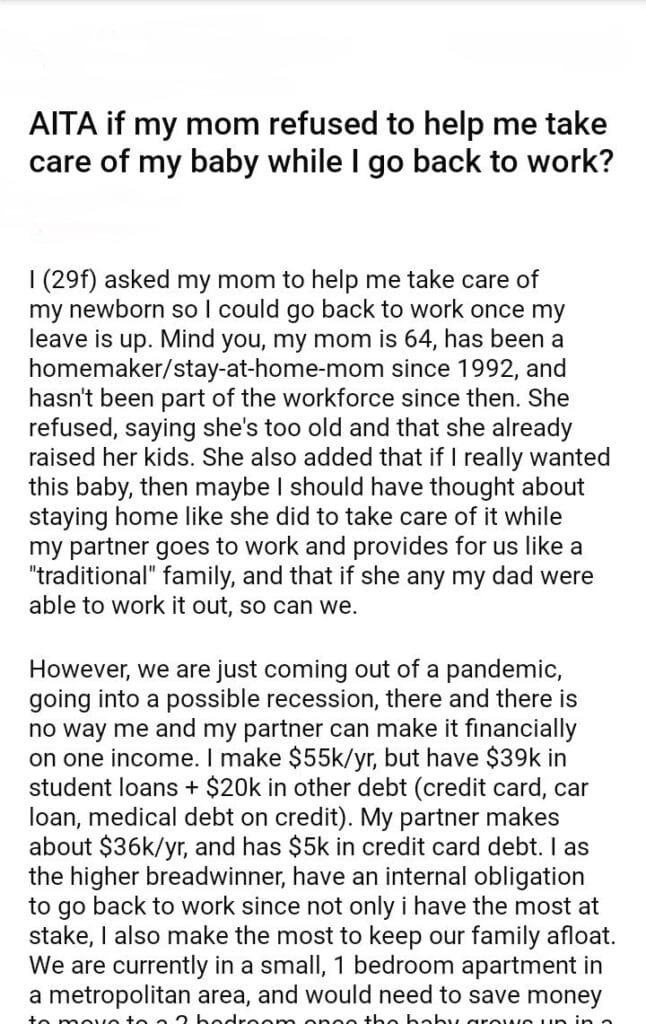 AITA if my mom refused to help me take care of my baby while I go back to work?