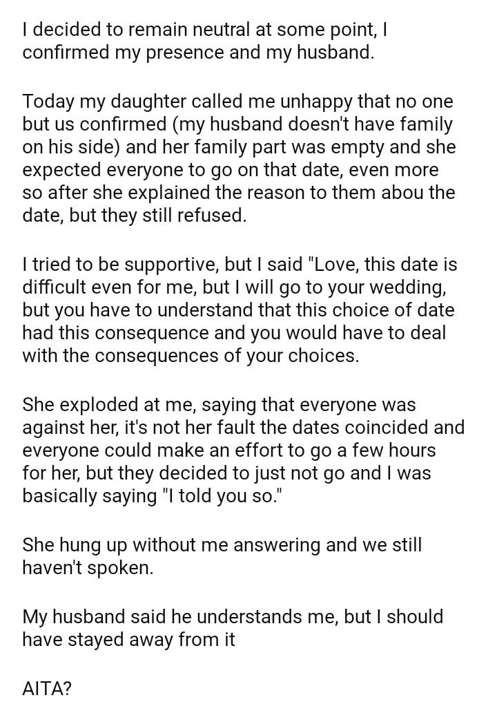 AITA telling my daughter she has to understand that choosing this wedding date would result in my family not going?