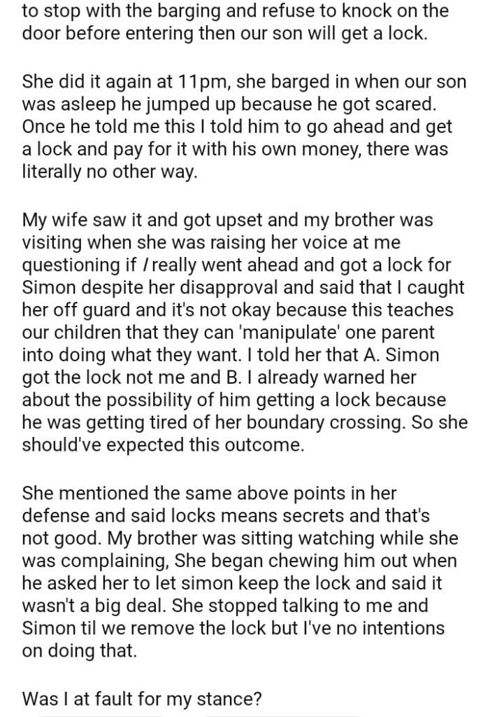 AITA…For telling my wife “I warned you” when our son got a lock for his room?
