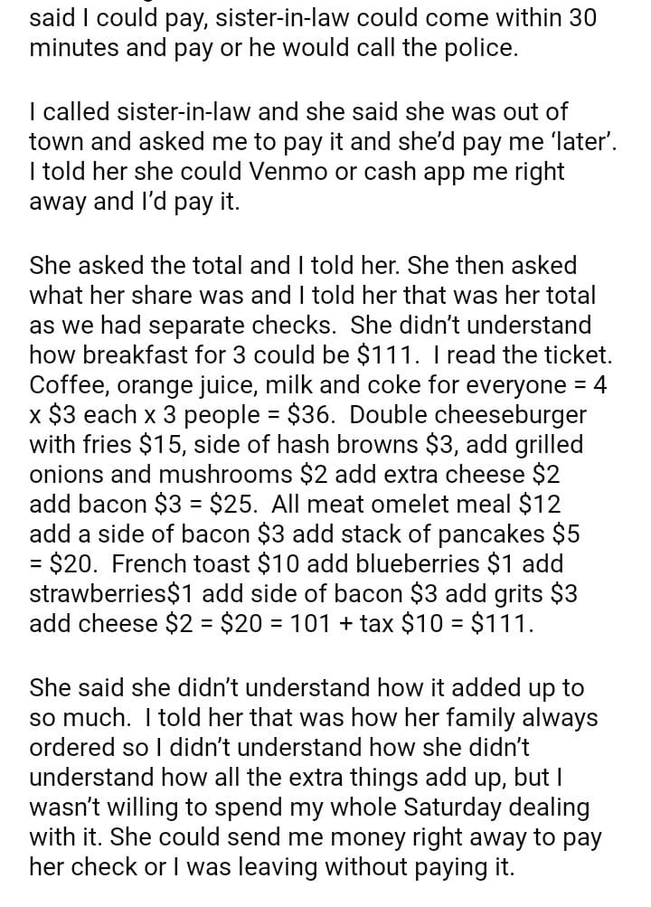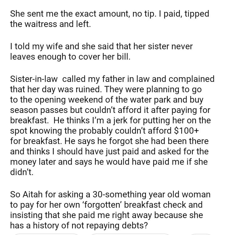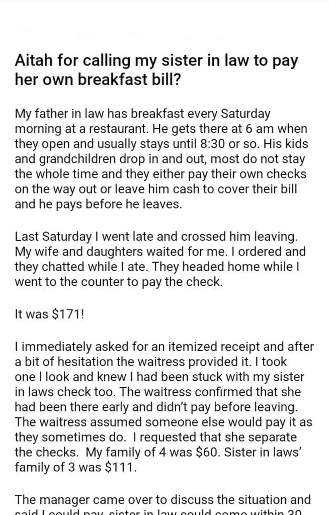 Aitah for calling my sister in law to pay her own breakfast bill?