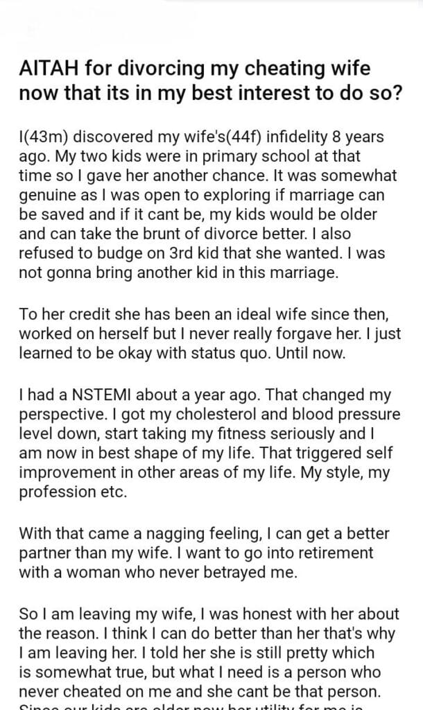 AITAH for divorcing my cheating wife now that its in my best interest to do so?