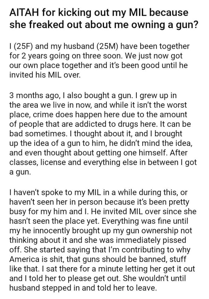 AITAH for kicking out my MIL because she freaked out about me owning a gun?