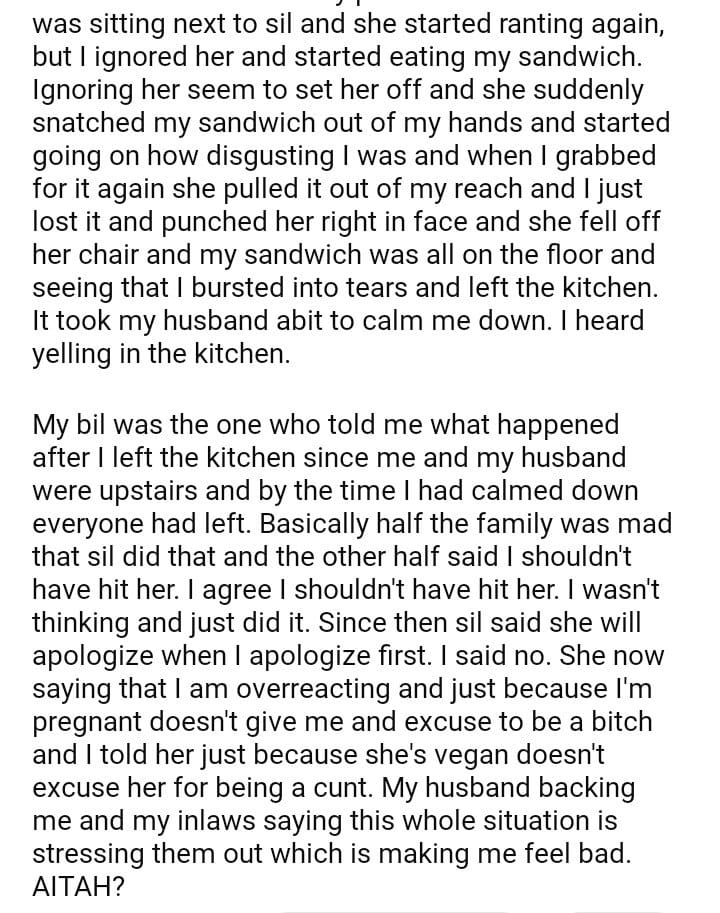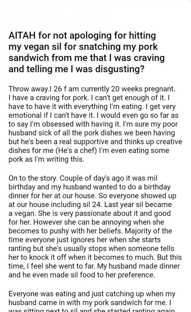 AITAH for not apologing for hitting my vegan sil for snatching my pork sandwich